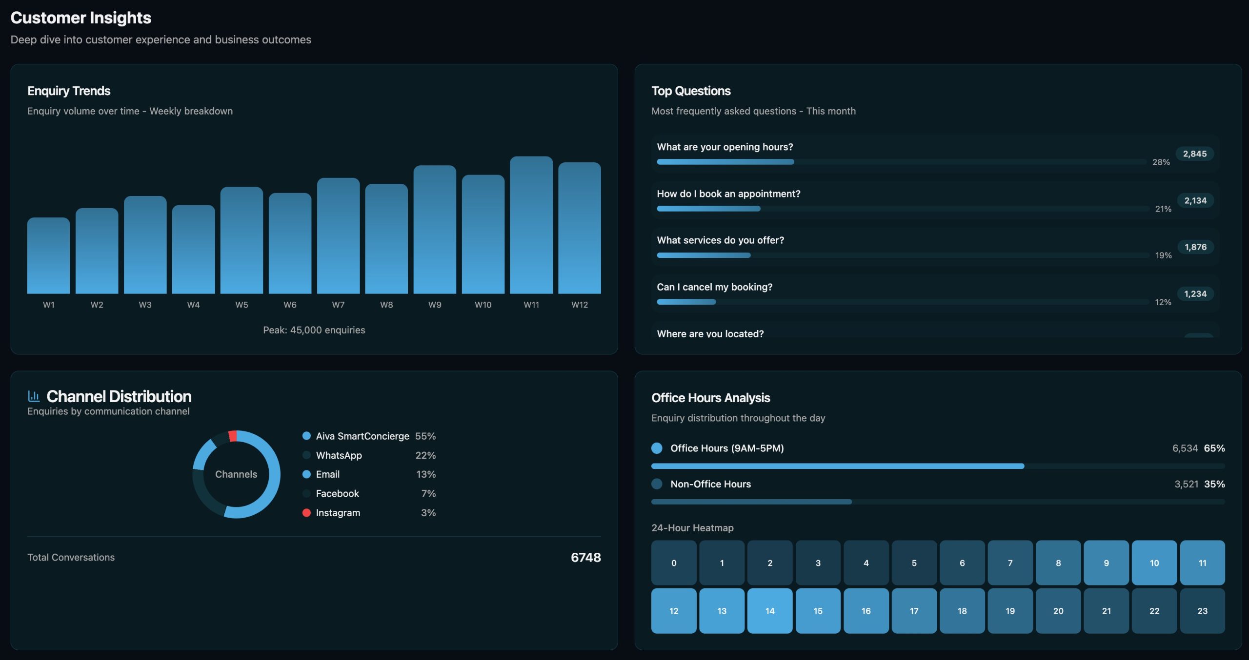 AIVA Revolution SmartAnalytics is built to work seamlessly with AIVA’s digital front of house platform — including SmartConcierge, SmartMail, and SmartSocial — bringing together every guest enquiry, message, and conversation into one intelligent insight platform.